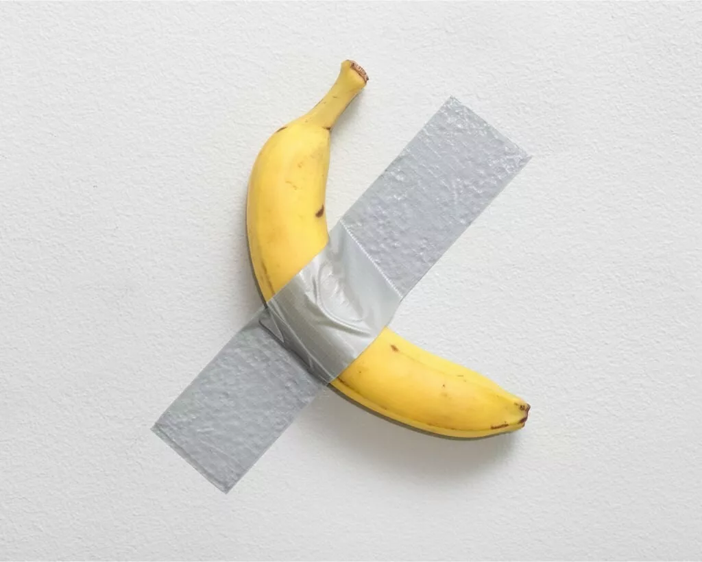 На аукционе Sotheby’s выставили произведение художника Маурицио Каттелана под названием «Приклеенный скотчем к стене банан».