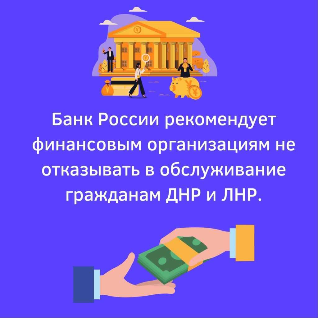 Банк России рекомендует кредитным организациям и некредитным финансовым организациям не отказывать гражданам ДНР и ЛНР, прибывшим
