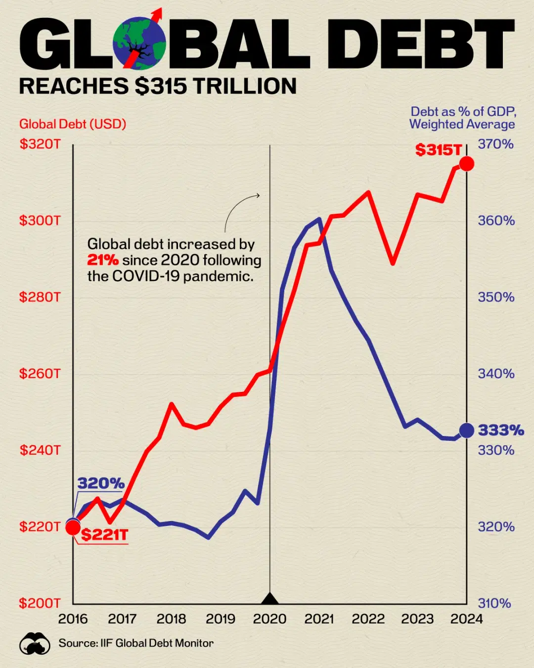 На этом графике представлен мировой долг по состоянию на первый квартал 2024 года.