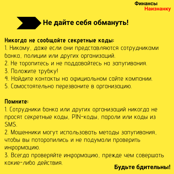 - Сотрудники банка или других организаций никогда не просят секретные коды, PIN-коды, пароли или коды из SMS.