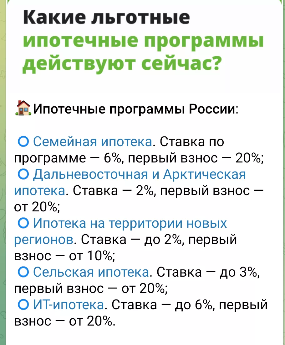 ⚪️Ипотека на территории новых регионов. Ставка — до 2%, первый взнос — от 10%;