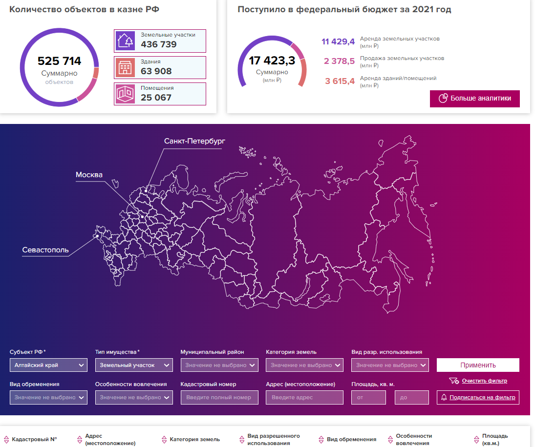 В «Маркетплейсе» собрана подробная информация об объектах недвижимого имущества казны Российской Федерации, реализованы фильтры и поиск по характеристикам. В «Личном кабинете заявителя» пользователи могут подать заявление и заключить сделку по выкупу или аренде выбранного объекта.