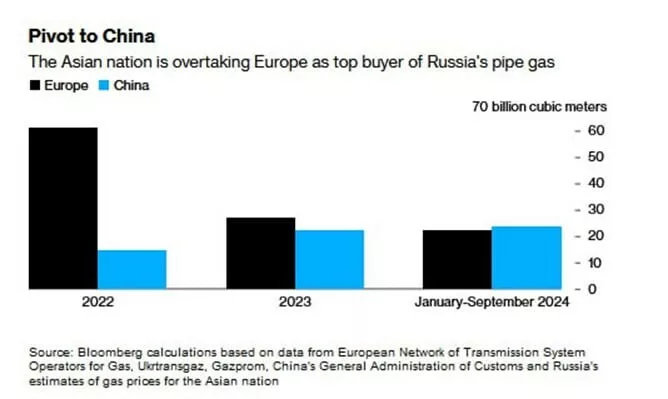 По данным Bloomberg, основанным на таможенных данных Китая и оценках Минэка России, ПАО «Газпром» за первые девять месяцев года экспортировал в Китай 23,7 млрд м3 природного газа, что на 40% превышает объемы экспорта годом ранее. Для сравнения, с января по сентябрь клиентам «Газпрома» в Европе было отправлено 22,5 млрд м3 газа.