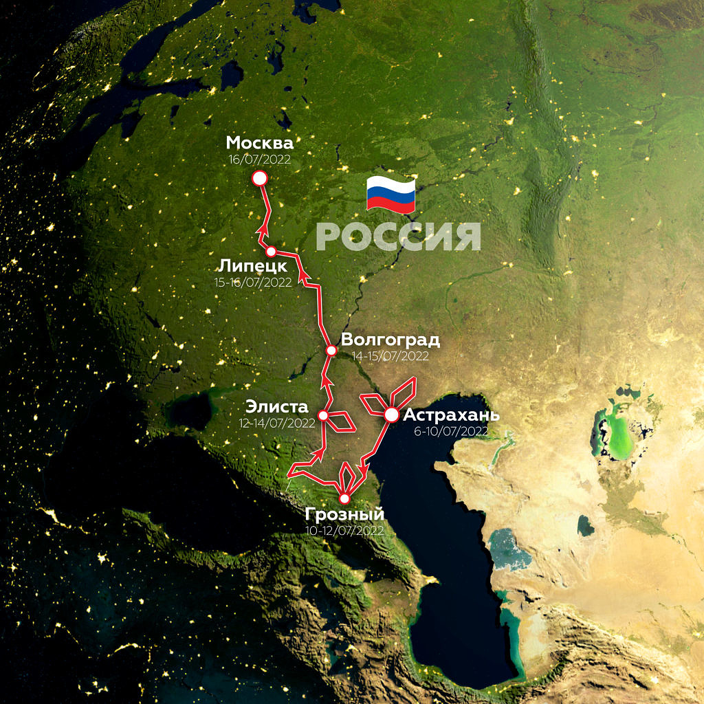 География маршрута изобилует самыми разными покрытиями, от астраханских песков до горных спецучастков Кавказа. Астрахань-Грозный-Элиста-Волгоград-Липецк-Москва
