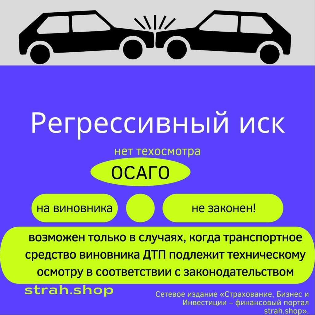 Принимая во внимание изложенное, отмечаем, что предъявление страховщиком регрессных требований к лицу, причинившему вред по основанию, изложенному в абзаце втором настоящего письма, возможно только в случаях, когда транспортное средство виновника дорожно-транспортного происшествия подлежит техническому осмотру в соответствии с законодательством в области технического осмотра транспортных средств, и срок действия диагностической карты, содержащей сведения о соответствии его транспортного средства обязательным требованиям безопасности транспортных средств, истек на момент наступления страхового случая, произошедшего вследствие неисправности транспортного средства.