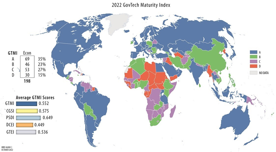 Индекс зрелости GovTech Maturity Index (GTMI) Всемирного банка на основе показателей, отражающих степень внедрения цифровых технологий в сфере госуслуг, налоговой и бюджетной сферах, в образовании и здравоохранении, измеряет ключевые аспекты по четырем приоритетным направлениям: