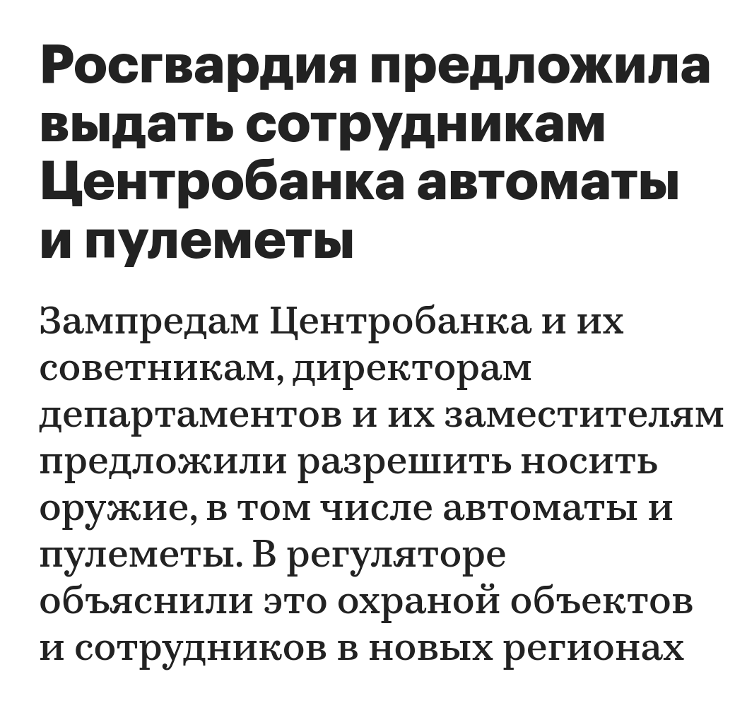 Росгвардия предложила дать право руководству ЦБ носить огнестрельное оружие.🤣