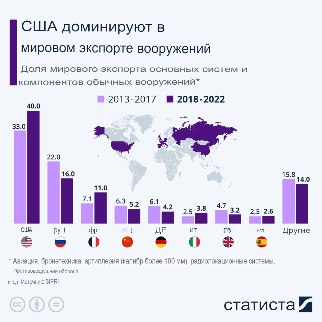 Доля Соединенных Штатов на международном рынке экспорта вооружений в период с 2018 по 2022 год составляла 40 процентов. Вторым по величине поставщиком основных видов оружия в мире была Россия, на долю которой пришлось 16 процентов экспорта за рассматриваемый период. В период с 2017 по 2021 год на долю Соединенных Штатов и России приходилось более половины основного экспорта вооружений. После бывших сверхдержав времен холодной войны ведущими мировыми поставщиками были Франция, Германия и Китай.