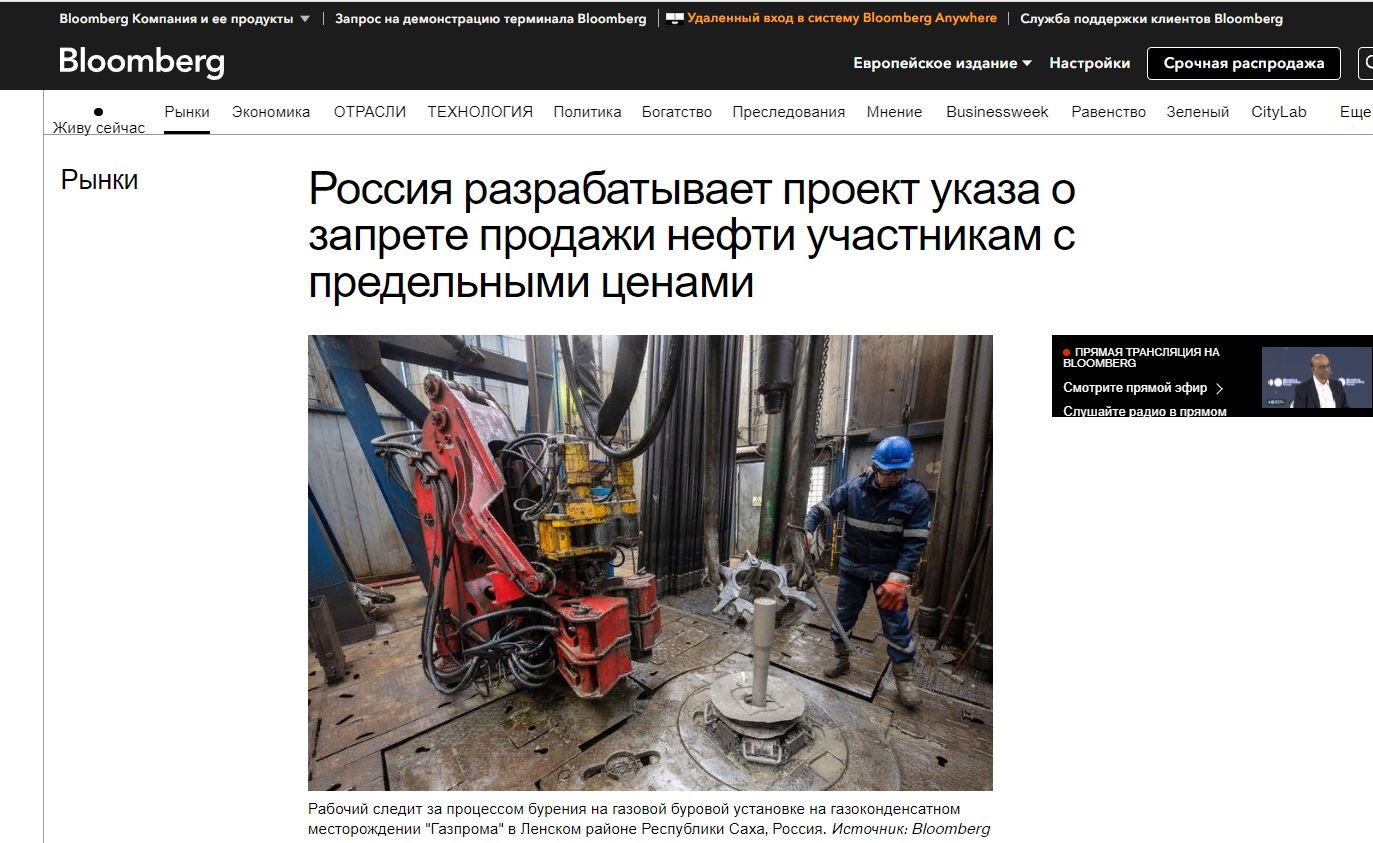 Кремль разрабатывает указ, который запретит российским компаниям и любым трейдерам, покупающим нефть в стране, продавать ее любому, кто участвует в ценовом ограничении — сообщает Bloomberg со ссылкой на свой источник.