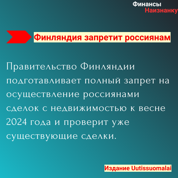Правительство Финляндии подготавливает полный запрет на осуществление россиянами сделок с недвижимостью, заявил министр обороны Антти Хакканен в интервью изданию Uutissuomalai. Предполагается, что данное решение может быть принято к весне 2024 года.
