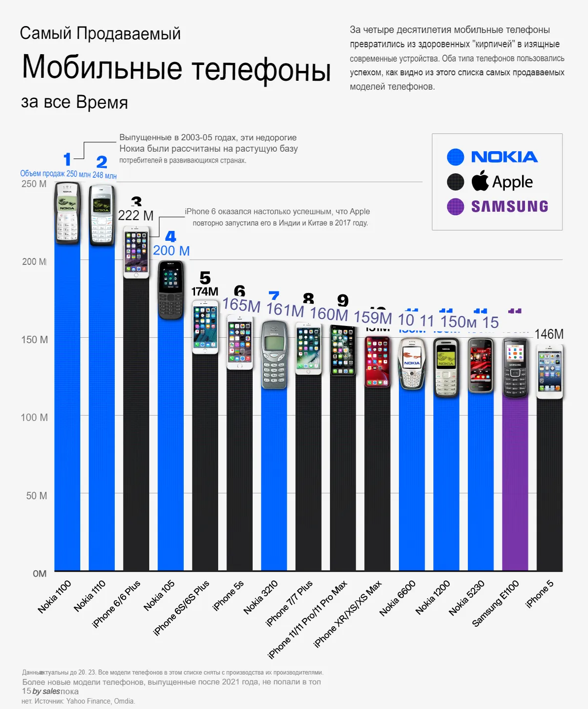 Используя данные из Википедии, Yahoo Finance и технической аналитической компании Omdia, мы составили график продаж мобильных телефонов, которые пользовались безусловным успехом.