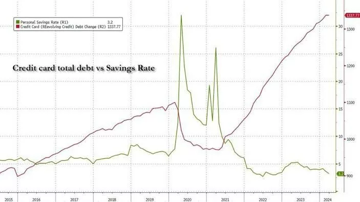 В то же время, уровень личных сбережений американцев находится на рекордно низких отметках. Этот показатель резко упал в последние годы, с кратковременным улучшением в первой половине 2023 года.