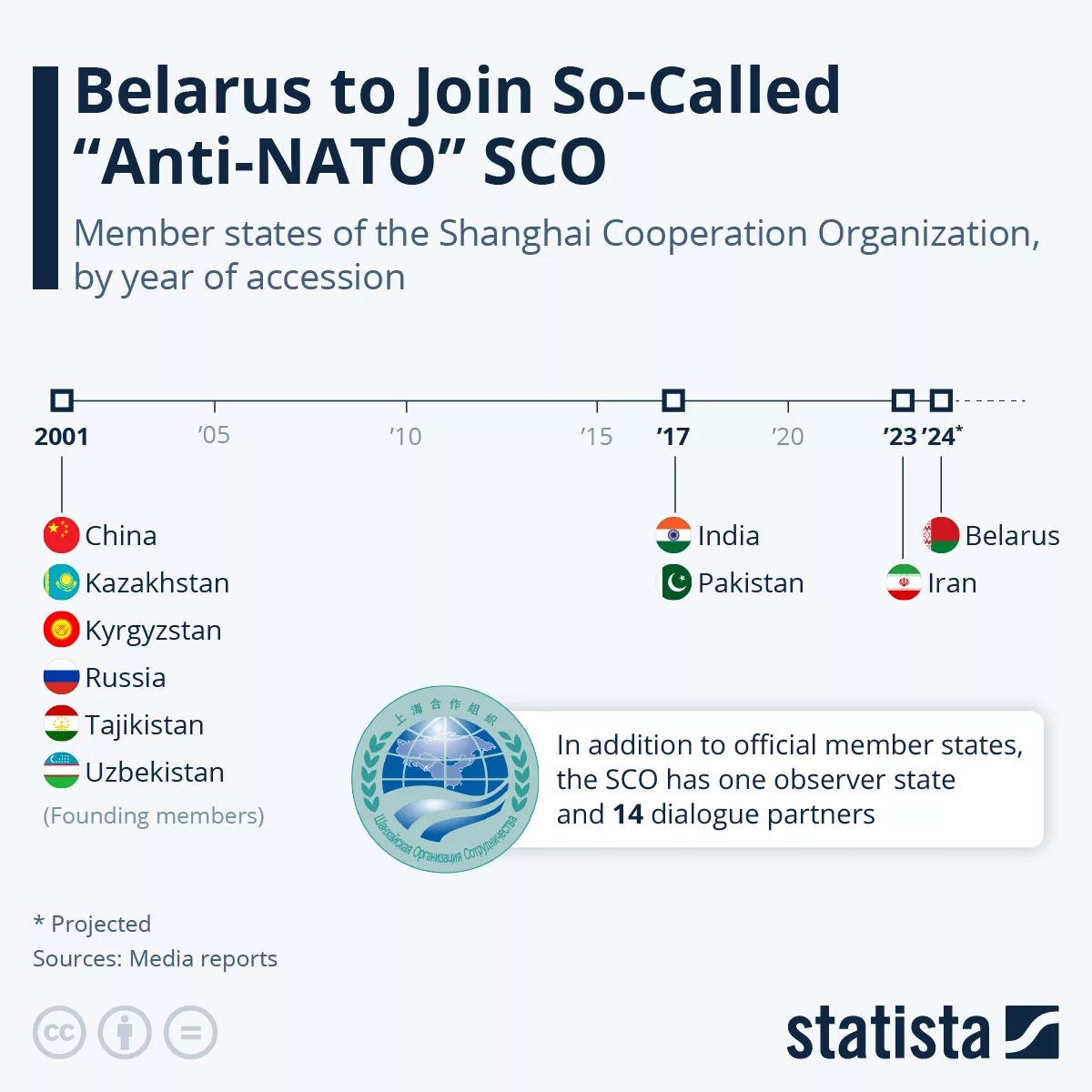 4 июля Беларусь присоединилась к Шанхайской организации сотрудничества (ШОС) на ее ежегодном саммите в качестве полноправного члена после официальной подачи заявки в сентябре 2022 года. Этот шаг увеличило число государств-членов в блоке до 10. Как показывает диаграмма, расширение ШОС за последнее десятилетие ускорилось.