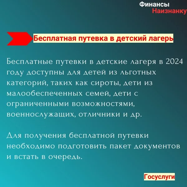 Бесплатные путевки в детские лагеря в 2024 году доступны для детей из льготных категорий, таких как сироты, дети из малообеспеченных семей, дети с ограниченными возможностями, военнослужащих, отличники и др. Для получения бесплатной путевки необходимо подготовить пакет документов и встать в очередь.