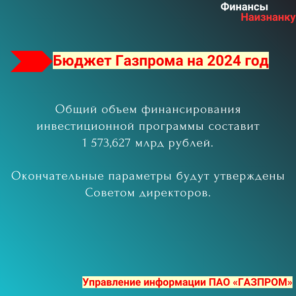 Правление «Газпрома» утвердило проекты инвестиционной программы и бюджета на 2024 год. Общий объем финансирования инвестиционной программы составит 1 573,627 млрд рублей. Окончательные параметры будут утверждены Советом директоров.