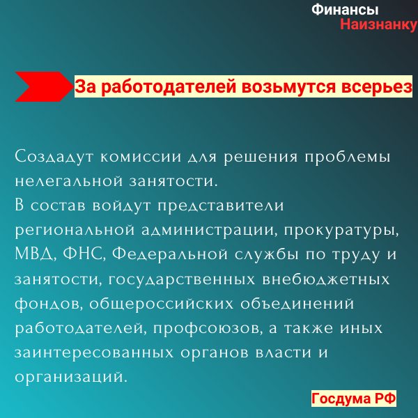 Работодатели, уклоняющиеся от уплаты налогов, станут объектом серьезного внимания. В регионах будут созданы специальные комиссии, объединяющие представителей налоговых органов, прокуратуры и МВД, для борьбы с незаконной занятостью.