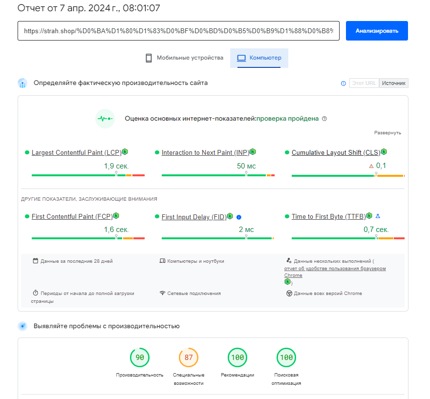Производительность 90%, так как ругается на свою же аналитику Google Tags и Яндекс метрику. Специальные возможности 87%, так как необходимо еще поработать с дизайном для слабовидящих (ругается на контраст цвета ссылок в тексте и размер шрифтов в блоке автора, позже допилю).