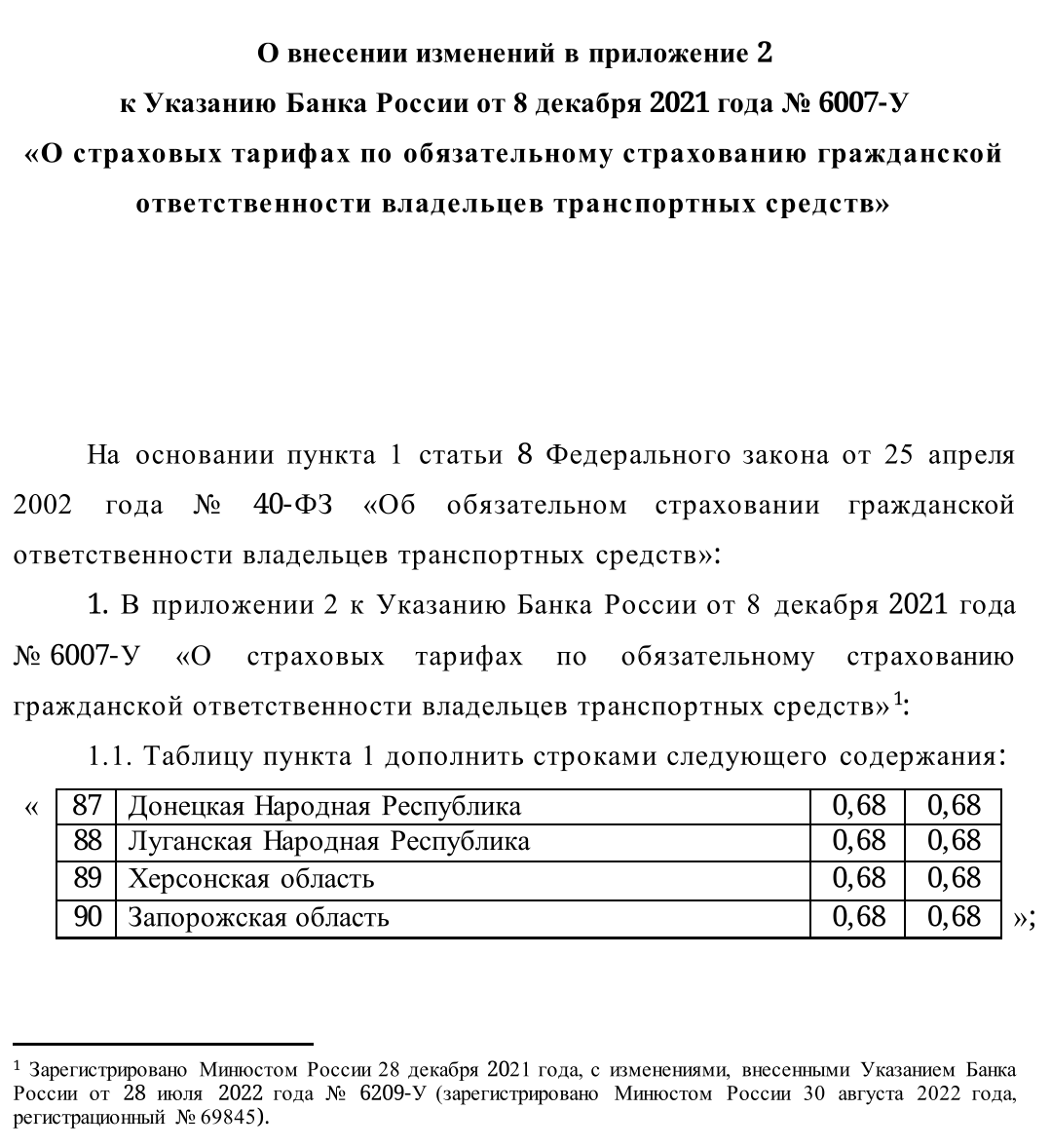 В указании также определены коэффициенты ОСАГО для Луганской и Донецкой народных республик, а также для Херсонской и Запорожской областей, которые будут равняться 0,68.