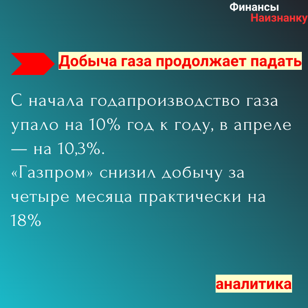 В январе—апреле производство газа упало на 10% год к году, до 235 млрд кубометров, в апреле — на 10,3%, до 55 млрд кубометров. «Газпром» снизил добычу за четыре месяца практически на 18,4% из-за снижения экспорта в ЕС.