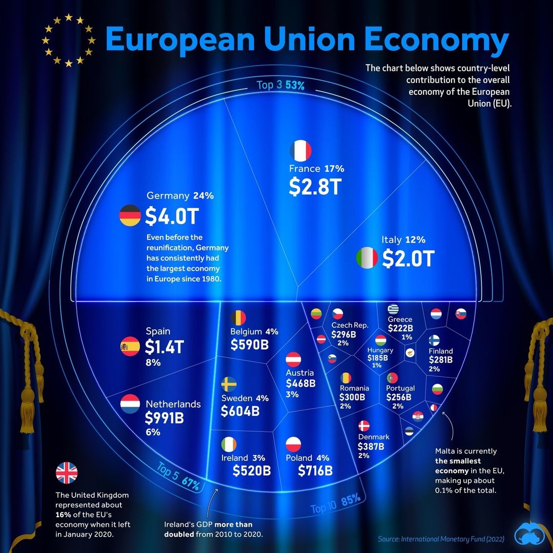 Европейский Союз занимает третье место в мире по объему экономикиЧто это простыми словами? Экономика - это наука, изучающая производство, распределение и потребление материальных благ и услуг. Эта наука помогает понять, как общество использует ресурсы для удовлетворения своих потребностей. Основные задачи экономики - это оптимизация производства и распределения, создание условий для стабильного экономического роста и улучшения жизни людей. Для достижения этих целей экономисты исследуют отношения между спросом и предложением товаров и услуг, цены и заработные платы, налоговую и бюджетную политику, международную торговлю и многое другое. Экономика также занимается исследованием различных форм экономических систем, таких как рыночная экономика, командно-административная экономика и смешанная экономика. В каждой из этих систем государство и рынок играют разные роли в производстве, распределении и потреблении материальных благ и услуг. В целом, экономика играет важную роль в функционировании общества и определяет его жизненный уровень. Понимание ее принципов и методов может помочь людям принимать более обоснованные экономические решения и внести свой вклад в развитие экономики своего региона или страны. Экономика в современном мире В современном мире бизнес не может существовать без экономики и, наоборот, экономика не может жить без бизнеса. Развитие бизнеса во многом зависит от экономических условий в стране. Поэтому для успешного ведения бизнеса необходимо понимать экономические процессы и принимать здравые решения, основываясь на анализе экономических данных. На сегодняшний день экономика подразделяется на несколько видов: социалистическая, капиталистическая и смешанная экономика: