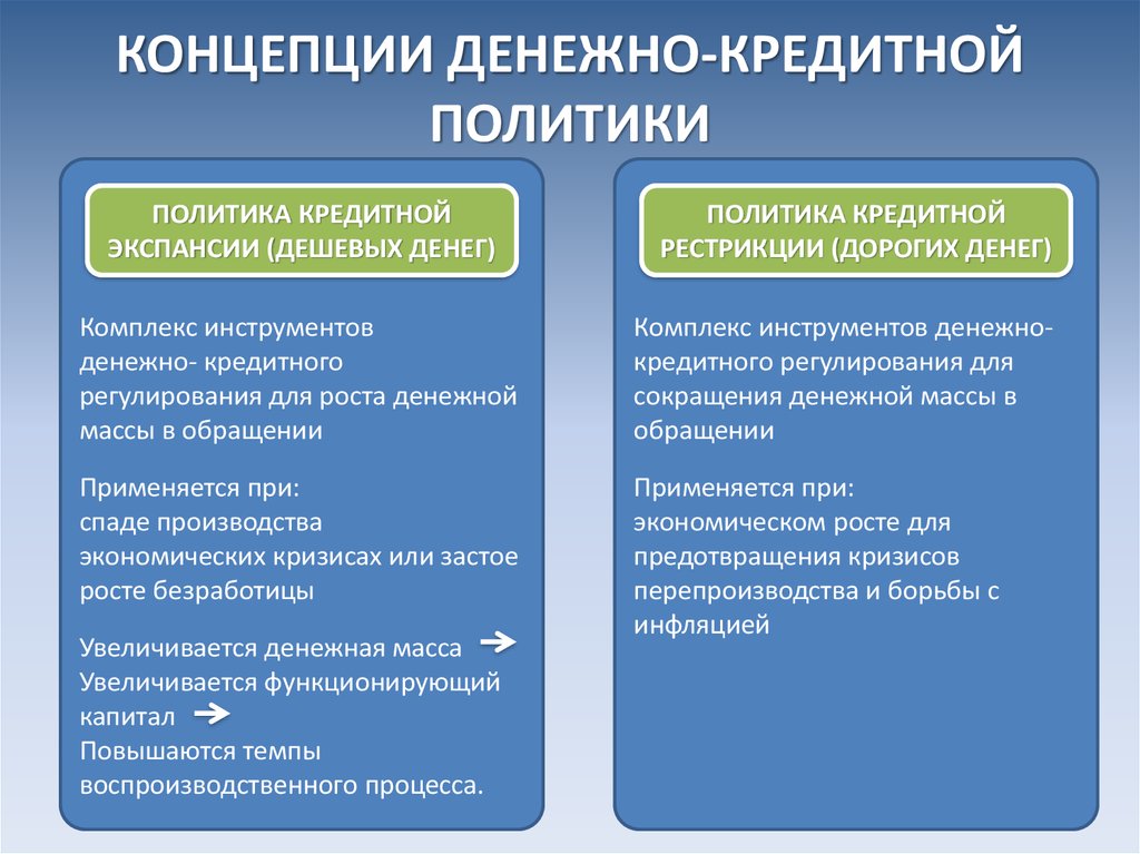 Денежно-кредитная политика (ДКП) – это комплекс государственных мер по управлению финансовыми потоками в стране. Она позволяет регулировать состояние кредитного рынка, контролировать деятельность коммерческих банков, воздействовать на деловую активность и совокупный спрос. По-другому ее еще называют монетарной политикой.
