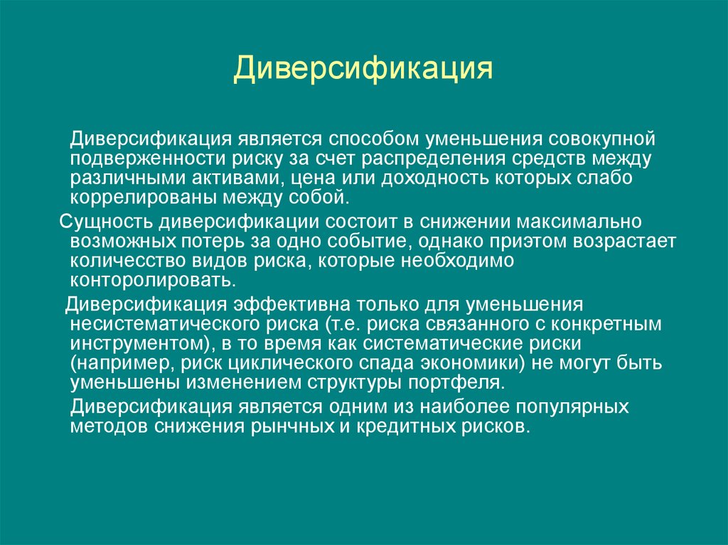 Посредством диверсификации инвесторы стремятся снизить риски, превышающие контролируемые, на основе удерживаемых инвестиций.