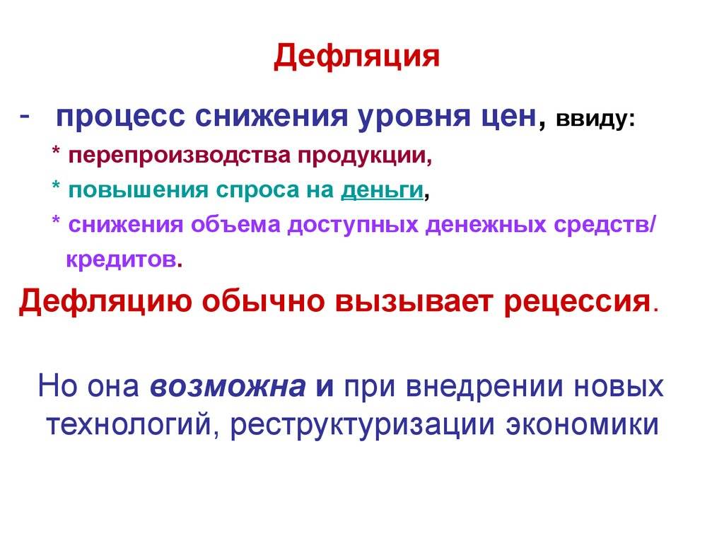 Дефляция — это процесс снижения уровня инфляции, который может быть вызван различными факторами, такими как сокращение денежной массы, увеличение налоговых ставок, увеличение производства, сокращение затрат на производство, изменения в экономической политике правительства и другие причины. и т.д.