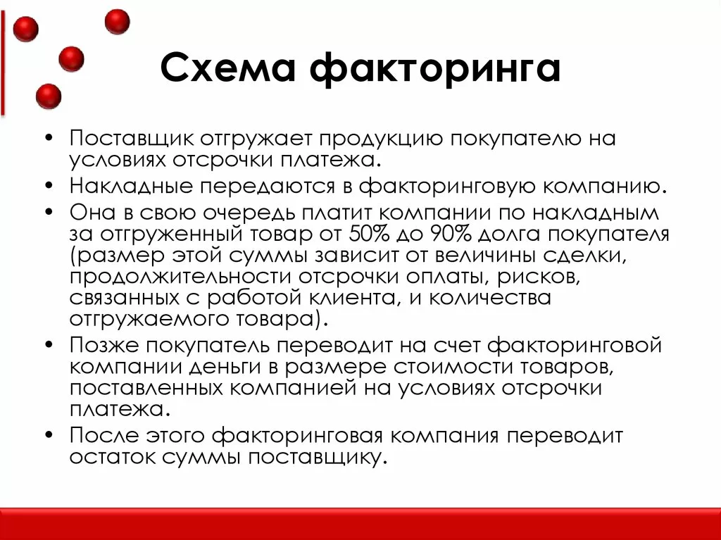 Факторинг — это когда вы продаёте товар с условием, что покупатель заплатит позже. Вы выставляете счёт покупателю, но деньги от него ещё не получили. Банк, микрофинансовая организация или факторинговая компания могут дать вам деньги раньше, чем покупатель. Они становятся посредниками между вами и покупателем. Они могут также помогать с документами. Так в расчетах между продавцом и клиентом появляется посредник — фактор.