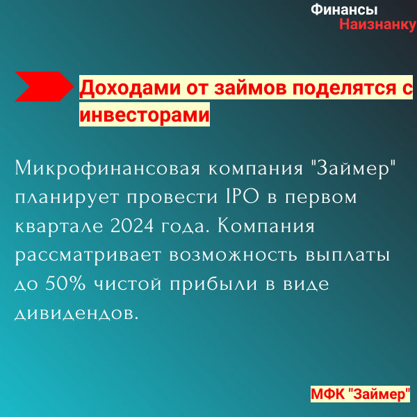 Микрофинансовая компания «Займер», одна из ведущих на рынке предоставления микрозаймов, планирует провести IPO в первом квартале 2024 года. Ожидается, что компания сможет привлечь около 5 миллиардов рублей, в основном от частных лиц. Для стимулирования интереса инвесторов, компания рассматривает возможность выплаты до 50% чистой прибыли в виде дивидендовДивиденды - это часть прибыли акционерного общества или иного хозяйствующего субъекта, распределяемая между акционерами, участниками в соответствии с количеством и... подробнее.