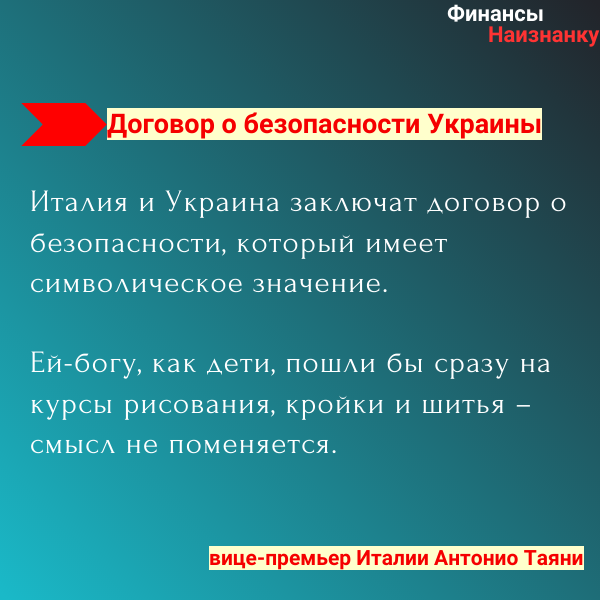 Италия и Украина планируют заключить двусторонний договор о безопасности, который не будет включать финансовые обязательства или гарантии политической и военной поддержки. Об этом заявил министр иностранных дел и вице-премьер Италии Антонио Таяни.