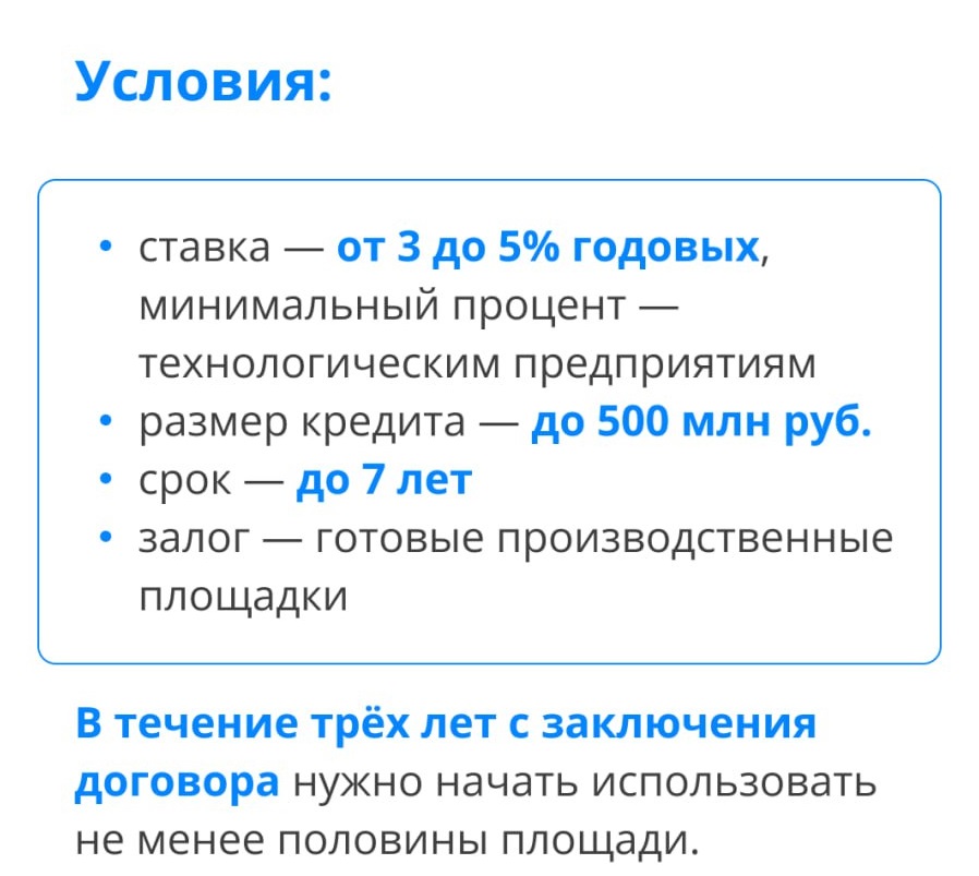 - ставка — от 3 до 5% годовых, минимальный процент для технологических предприятий.