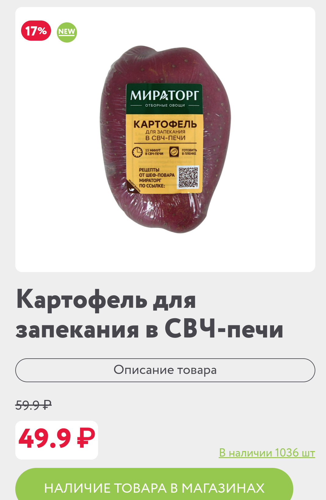 На просторах необъятного сайта Мираторга была обнаружена уникальная находка — картошка в индивидуальной упаковке, по цене всего лишь 49.9 рублей за одну персону!