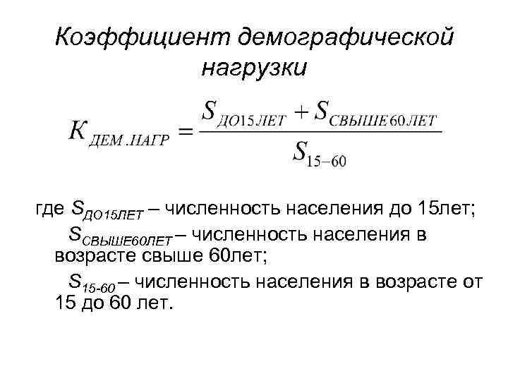 Коэффициент демографической нагрузки — это соотношение количества граждан нетрудоспособного и трудоспособного возраста. Используется для оценки статистики возрастного состава населения.