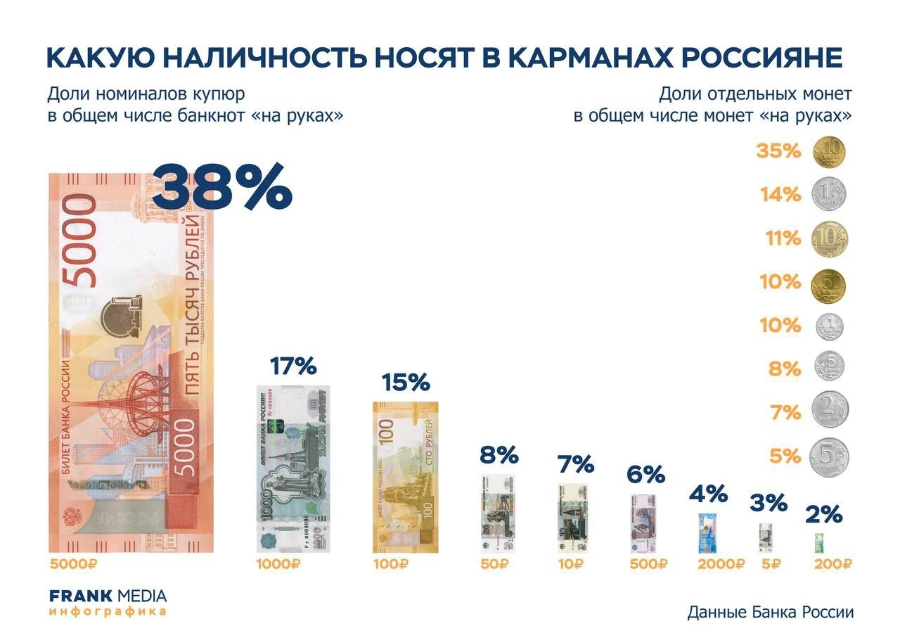 - Удельный вес банкнот номиналом 5, 10, 50 и 200 рублей в общей сумме составляет менее 0,5%.