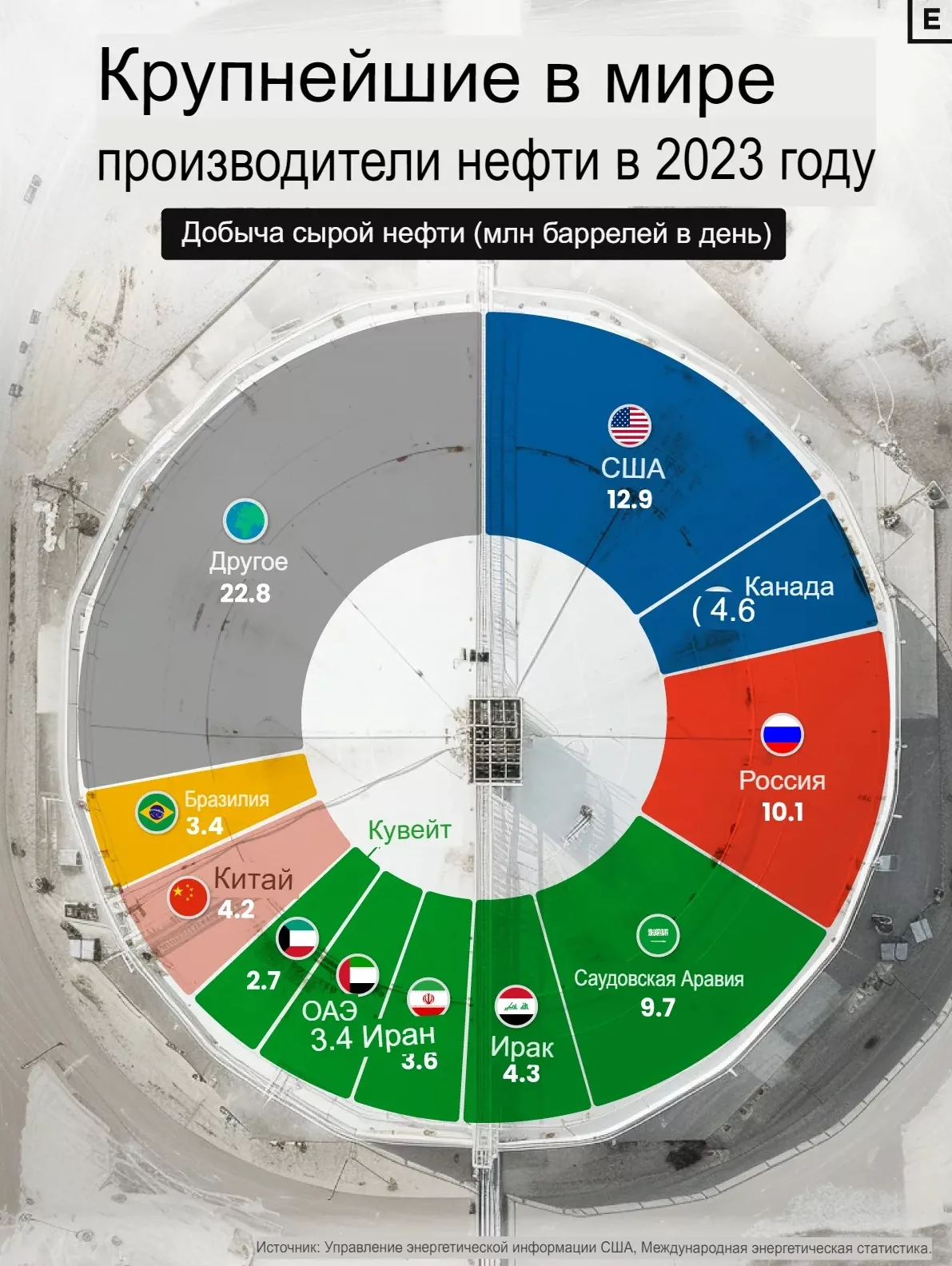 В 2023 году три страны – Соединенные Штаты, Россия и Саудовская Аравия – обеспечивали 32,7 миллиона баррелей в день от мировой добычи нефти. Вместе они составляли 40% от общего объема добычи (32,8 миллиона баррелей в сутки).