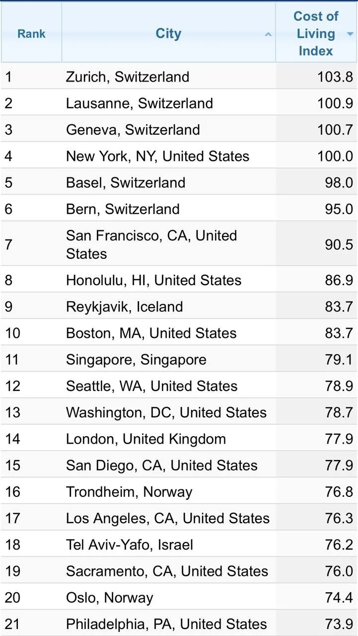 Лидером рейтинга, как и прежде, остаётся Цюрих.