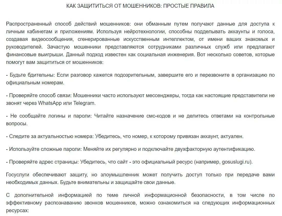 С дополнительной информацией по теме личной информационной безопасности, в том числе по эффективному распознаванию звонков мошенников, можно ознакомиться на Госуслугах: