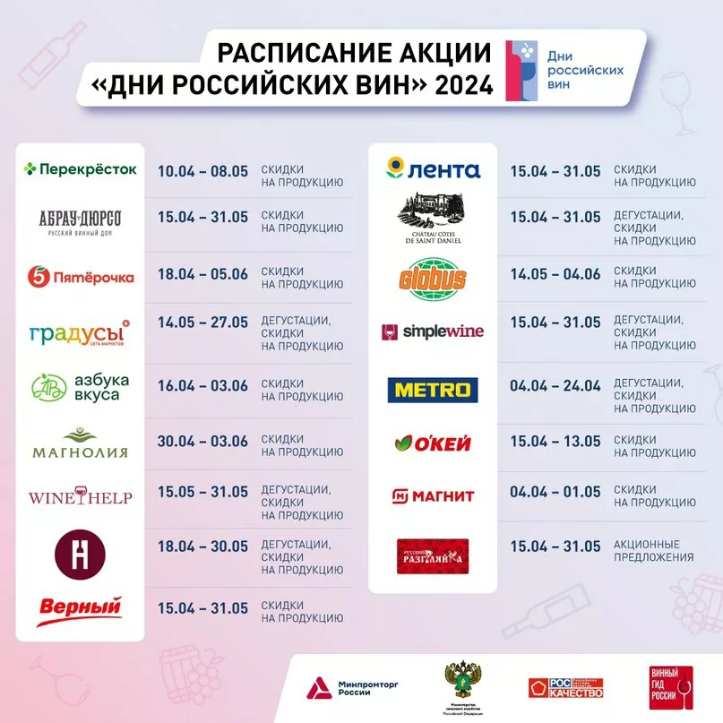 В рамках «Дней российских вин» вы сможете приобрести вина из отечественного винограда по специальным ценам, качество которых подтверждено экспертами.