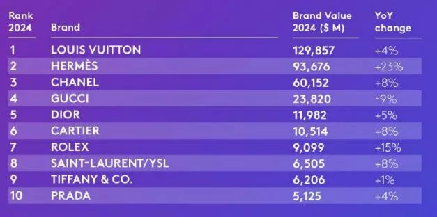 Louis Vuitton остаётся лидером, хотя и опустился с общего топ-10 на 12-е место среди 100 самых влиятельных брендов. Hermès продемонстрировал значительный рост, увеличив стоимость бренда на 23 %, что превышает общий рост сектора на 8 %.