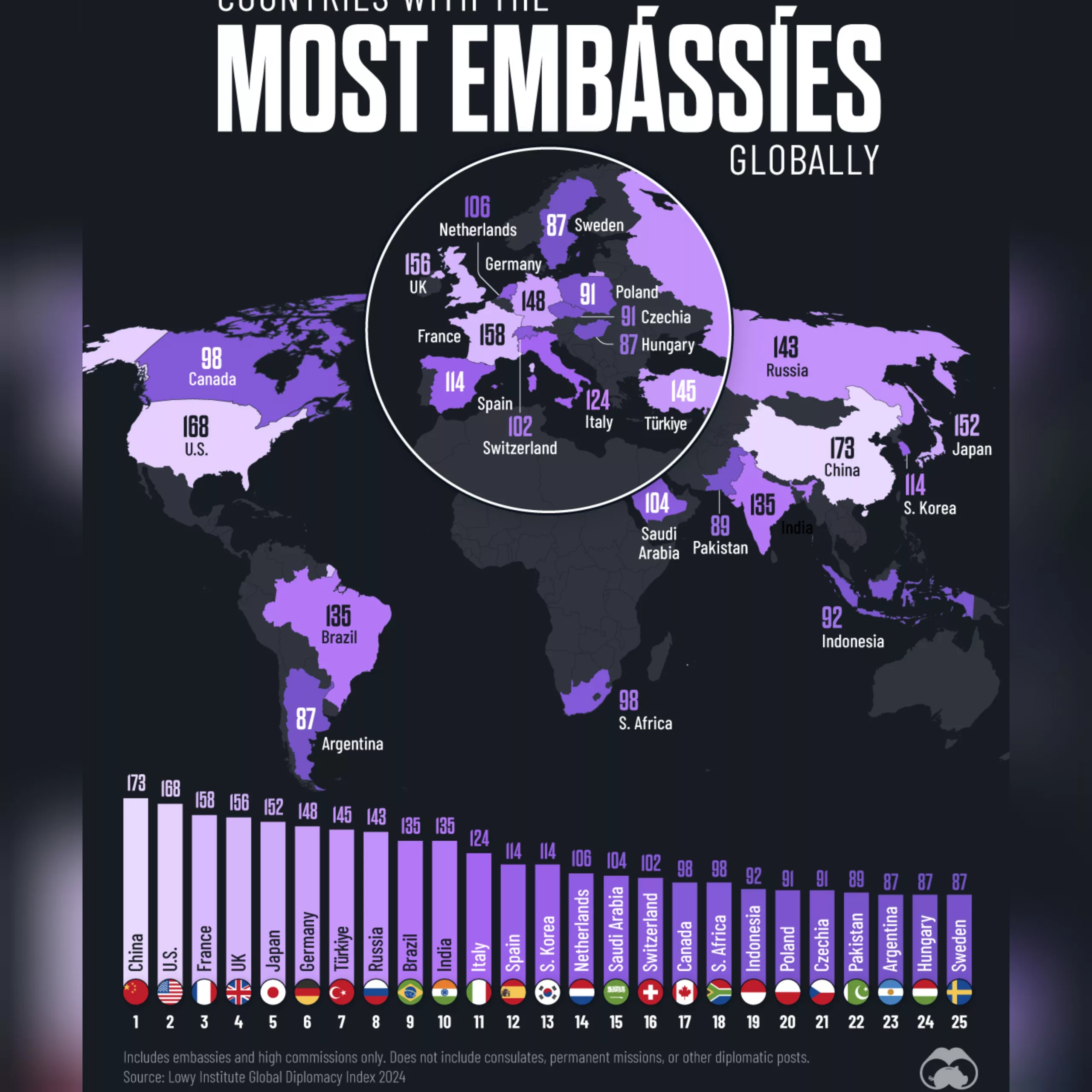 В последнем обновлении за 2024 год представлены 25 стран с наибольшим количеством посольств по всему миру. Данные актуальны на ноябрь 2023 года и не учитывают дипломатические последствия конфликта между Израилем и ХАМАС.
