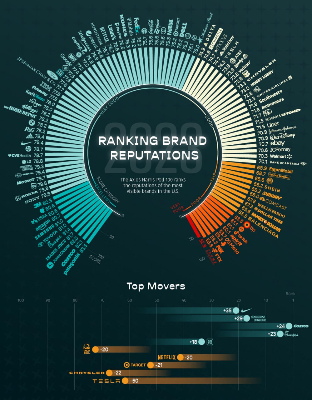 Рейтинг Axios Harris Poll 100 — это доверенное ранжирование репутации компаний, которые наиболее заметны для американцев, используя фреймворк, который Harris использует с 1999 года.