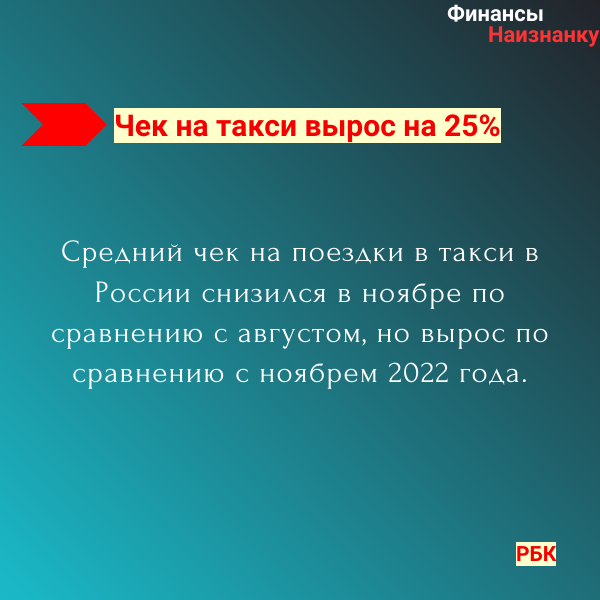 1. по данным ВТБ (оценка транзакций по картам банка), в России средний чек поездки c ноябрем 2022 года вырос на 25%;