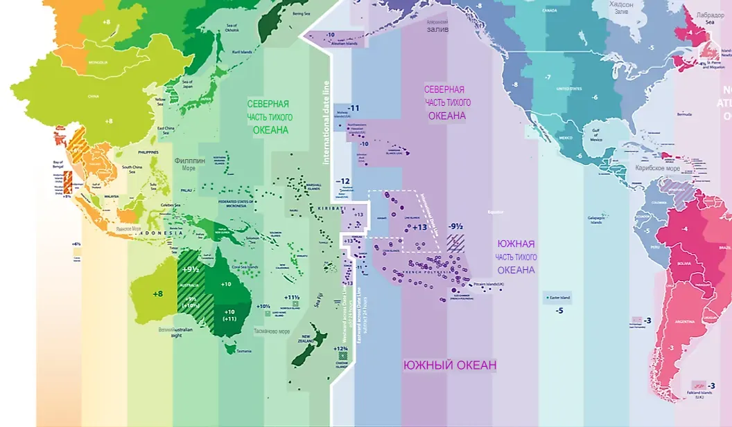 Интересно, что, несмотря на такую огромную разницу во времени, эти районы в Тихом океане находятся очень близко друг к другу.
