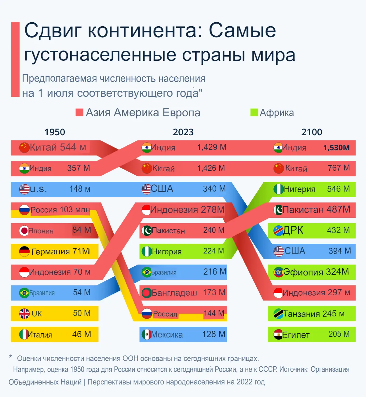 Учитывая, что население Европы уже сокращается, а темпы роста в Азии и Латинской Америке, как ожидается, станут отрицательными в 2050-х годах, Африка станет крупнейшим драйвером роста населения планеты на ближайшие десятилетия.
