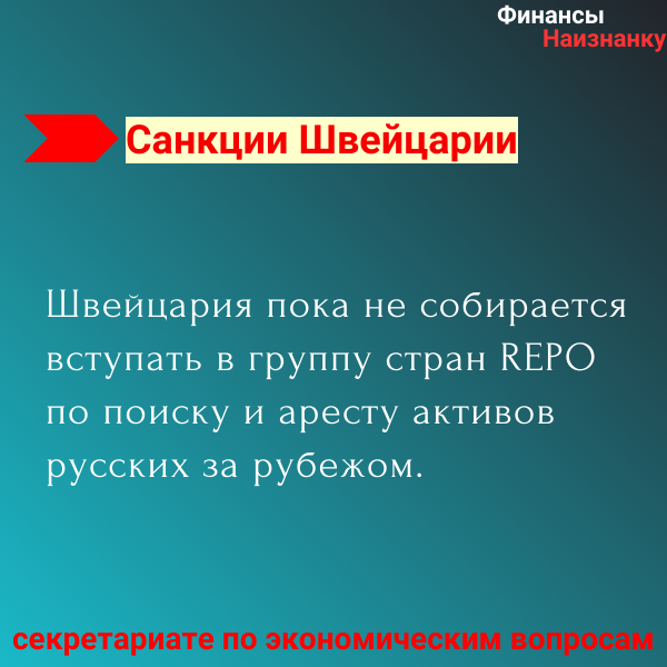 Швейцария сейчас не собирается вступать в группу REPO (Russian Elites, Proxies, and Oligarchs task force), которая занимается поиском и арестом иностранных активов россиян.