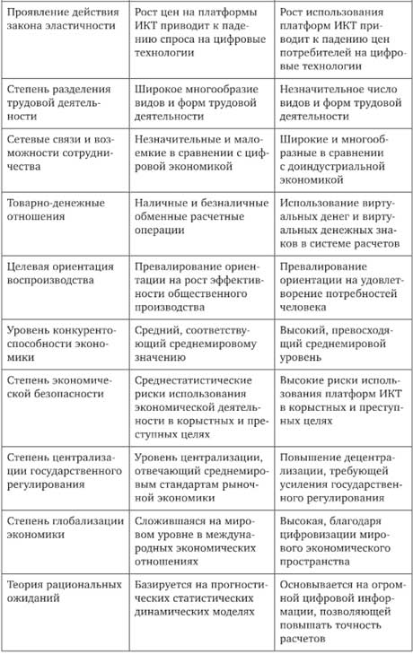 Рост цен на платформы ИКТ приводит к падению спроса на цифровые технологии в аналоговой индустриальной экономике, а в цифровой экономике увеличение использования платформ ИКТ приводит к падению цен потребителей на цифровые технологии.