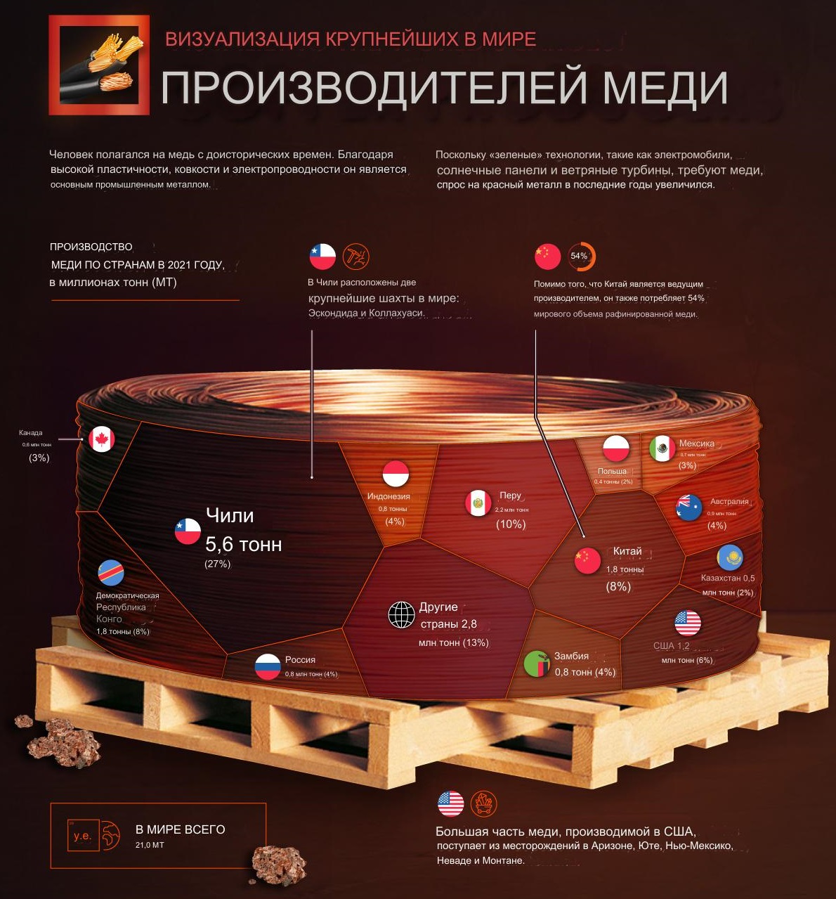 Демократическая Республика Конго (ДРК) и Китай делят третье место, с 8% каждый. Примечательно, что Китай, помимо того, что является одним из крупнейших производителей меди, также потребляет 54% всей рафинированной меди в мире.