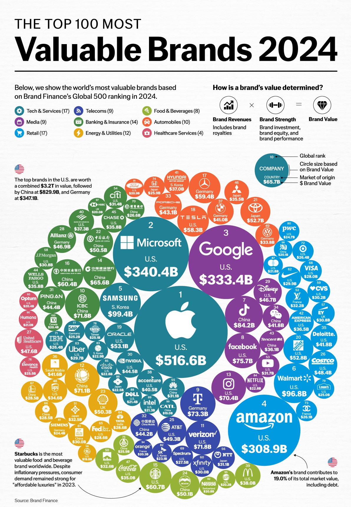 Самые ценные бренды: США лидируют. В 2024 году более половины из 100 самых ценных брендов базировались в Соединенных Штатах, их совокупная стоимость составляла 3,2 трлн долларов.