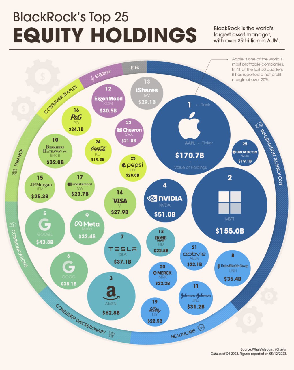 Компания BlackRock является крупнейшим в мире управляющим активами с активами под управлением (AUM) более $9 трлн. Согласно данным на первый квартал 2023 года, 25 крупнейших акций компании составляют около 30% от общего портфеля акций BlackRock, и их стоимость превышает $1 трлн.