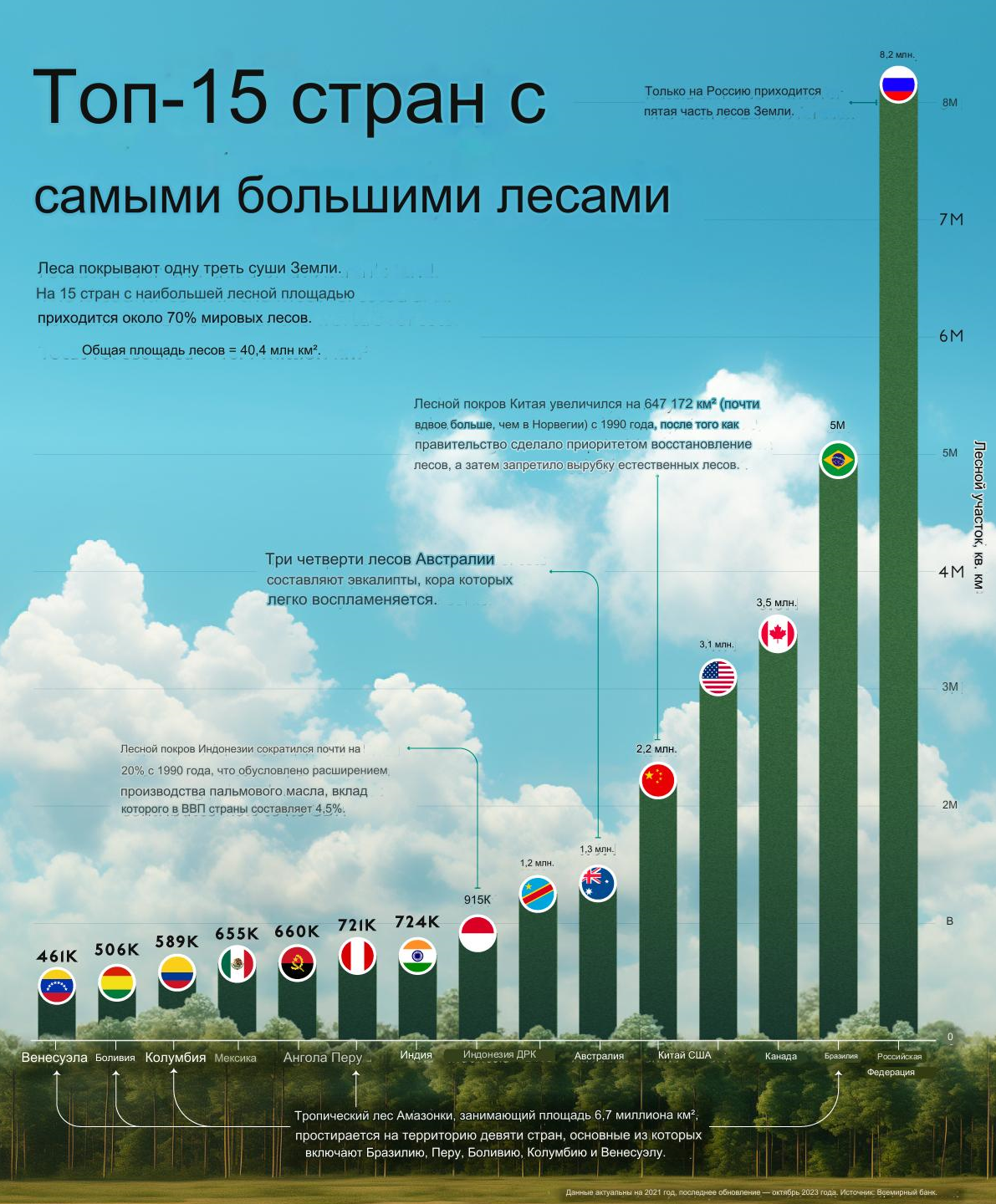 В статье показаны 20 стран с самыми большими лесами, измеряемых в квадратных километрах. Данные взяты из статьи Всемирного банка за 2021 год, которые в последний раз обновлялись в октябре 2023 года.